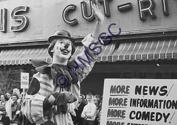 Accession Number:2001-51.273 Accession Date: Condition:good Location:Ward, box 5, folder 53 Keywords:Ward, Chancellor, KTTS, television, radio, clown, puppet, parade Area of Origin:Springfield, MO Period:ca. 1960 Category:documentary artifact Object:print, photographic Maker:uk Description/History:A black and white photo of a clown and puppet in a parade. News-Leader Photo Information:
