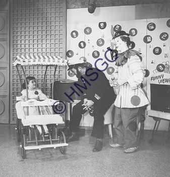 Accession Number:2001-51.285 Accession Date: Condition:good Location:Ward, box 5, folder 65 Keywords:Captain Briny, children, clown, KTTS, television, Ward, Chancellor, radio Area of Origin:Springfield, MO Period:ca. 1960 Category:documentary artifact Object:print, photographic Maker:Haden Description/History:A black and white photo of Captain Briny and clown with a child in a cart/surrey. News-Leader Photo Information: