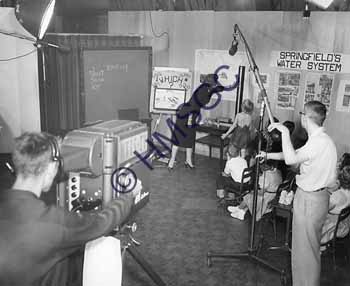 Accession Number:2001-51.287 Accession Date: Condition:good Location:Ward, box 5, folder 67 Keywords:Ward, Chancellor, KTTS, television, radio, teacher, class, camera, water, education Area of Origin:Springfield, MO Period:ca. 1960 Category:documentary artifact Object:print, photographic Maker:uk Description/History:A black and white photo of a teacher educating a class about Springfield's water system. News-Leader Photo Information: