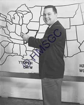Accession Number:2001-51.291 Accession Date: Condition:good Location:Ward, box 5, folder 71 Keywords:Ward, Chancellor, KTTS, television, radio, men, weatherman Area of Origin:Springfield, MO Period:ca. 1960 Category:documentary artifact Object:print, photographic Maker:uk Description/History:A black and white photo of a weatherman. News-Leader Photo Information: