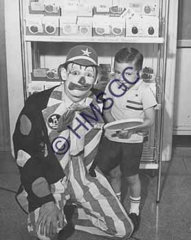 Accession Number:2001-51.297 Accession Date: Condition:good Location:Ward, box 5, folder 77 Keywords:Ward, Chancellor, KTTS, television, radio, clown, children, boy Area of Origin:Springfield, MO Period:ca. 1960 Category:documentary artifact Object:print, photographic Maker:uk Description/History:A black and white photo of a clown with a young boy. News-Leader Photo Information: