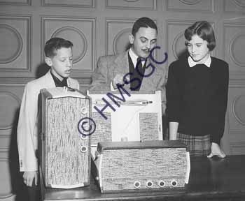 Accession Number:2001-51.317 Accession Date: Condition:good Location:Ward, box 5, folder 97 Keywords:Ward, Chancellor, KTTS, television, radio, children, stereo, Haden Area of Origin:Springfield, MO Period:ca. 1960 Category:documentary artifact Object:print, photographic Maker:Haden Description/History:A black and white photo of two children and one man looking at a large stereo. News-Leader Photo Information: