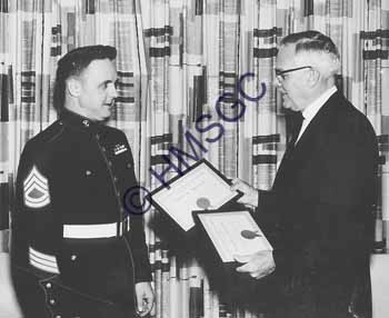 Accession Number:2001-51.338 Accession Date: Condition:good Location:Ward, box 6, folder 8 Keywords:1960, Ward, Chancellor, KTTS, television, radio, men, award, military, marine, Haden Area of Origin:Springfield, MO Period:ca.1960 Category:documentary artifact Object:print, photographic Maker:Haden Description/History:A black and white photo of an award presentation from one man to a marine (left). News-Leader Photo Information: