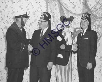 A black and white photo of Captain Briny, clown and two Shriners.