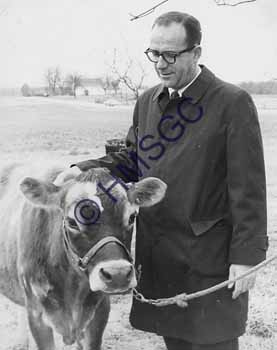 Accession Number:2001-51.378 Accession Date: Condition:good Location:Ward, box 6, folder 48 Keywords:1960, Ward, Chancellor, KTTS, television, radio, men, cow, livestock Area of Origin:Springfield, MO Period:ca. 1960 Category:documentary artifact Object:print, photographic Maker:uk Description/History:A black and white photo of a man standing next to cow. News-Leader Photo Information: