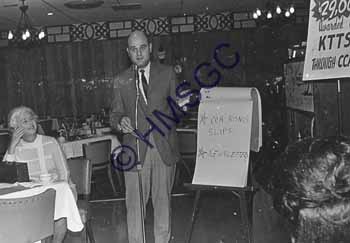 Accession Number:2001-51.384 Accession Date: Condition:fair Location:Ward, box 6, folder 54 Keywords:1960, Ward, Chancellor, KTTS, television, radio, speech Area of Origin:Springfield, MO Period:ca. 1960 Category:documentary artifact Object:print, photographic Maker:uk Description/History:A black and white photo of a man giving a speech. Woman sits left. News-Leader Photo Information: