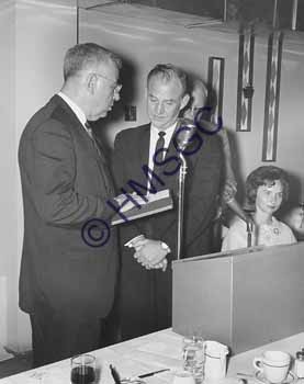 Accession Number:2001-51.390 Accession Date: Condition:good Location:Ward, box 6, folder 60 Keywords:1960, Ward, Chancellor, KTTS, television, radio, men, podium Area of Origin:Springfield, MO Period:ca. 1960 Category:documentary artifact Object:print, photographic Maker:uk Description/History:A black and white photo of men at a podium. News-Leader Photo Information: