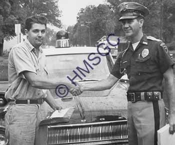 Accession Number:2001-51.395 Accession Date: Condition:good Location:Ward, box 6, folder 65 Keywords:1960, Ward, Chancellor, KTTS, television, radio, policeman, officer, men, handshake, car Area of Origin:Springfield, MO Period:ca. 1960 Category:documentary artifact Object:print, photographic Maker:uk Description/History:A black and white photo of a policeman shaking hands with a citizen in front of a patrol card. News-Leader Photo Information: