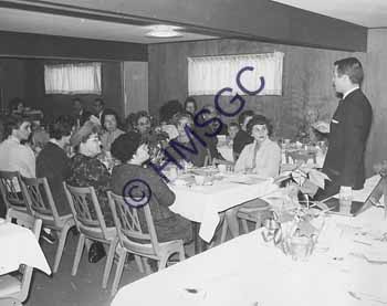Accession Number:2001-51.399 Accession Date: Condition:good Location:Ward, box 6, folder 69 Keywords:1960, Ward, Chancellor, KTTS, television, radio, women, speech, banquet Area of Origin:Springfield, MO Period:ca. 1965 Category:documentary artifact Object:print, photographic Maker:uk Description/History:A black and white photo of a man speaking in front of a group of women dining in a banquet setting. News-Leader Photo Information: