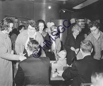 |  Accession Number:2001-51.404  Accession Date:  Condition:good  Location:Ward, box 6, folder 74  Keywords:Ward, Chancellor, KTTS, television, radio, women, anniversary, Ladies Show, 1960  Area of Origin:Springfield, MO  Period:2/1966  Category:documentary artifact  Object:print, photographic  Maker:uk  Description/History:A black and white photo of women standing in line to approach two men sitting at a table handing out what appears to be tickets.  Back reads:  "2nd Anniversary of Ladies Show."  News-Leader Photo Information: |