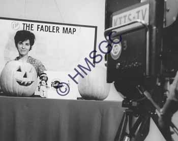 | Accession Number:2001-51.408 Accession Date: Condition:good Location:Ward, box 6, folder 78 Keywords:Ward, Chancellor, KTTS, television, radio, jack-o-lantern, Halloween, camera, Fadler Map, toys, 1960 Area of Origin:Springfield, MO Period:ca. 1965 Category:documentary artifact Object:print, photographic Maker:uk Description/History:A black and white photo of Miss Jo with a jack-o-lantern and toy indians being filmed by a KTTS camera. A map of the U.S. entitled: "The Fadler Map" can be viewed behind her. News-Leader Photo Information: |
