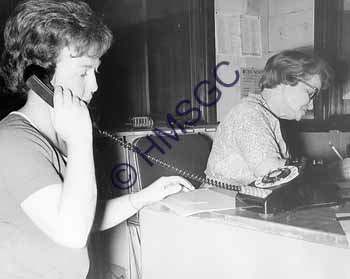 Accession Number:2001-51.415 Accession Date: Condition:good Location:Ward, box 6, folder 85 Keywords:Ward, Chancellor, KTTS, television, radio, women, telephone Area of Origin:Springfield, MO Period:ca. 1965 Category:documentary artifact Object:print, photographic Maker:uk Description/History:A black and white photo of two women, nearest woman (left) is on the telephone. An older woman (right) in distance writes with a pencil. News-Leader Photo Information: