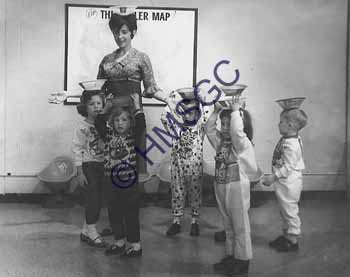 |  Accession Number:2001-51.420  Accession Date:  Condition:good  Location:Ward, box 6, folder 90  Keywords:Ward, Chancellor, KTTS, television, radio, children, balance, bowls, game, poise, posture, Miss Jo, Romper Room  Area of Origin:Springfield, MO  Period:ca. 1965  Category:documentary artifact  Object:print, photographic  Maker:uk  Description/History:A black and white photo of Miss Jo of Romper Room and six children balancing bowls on their heads while standing.  News-Leader Photo Information: |