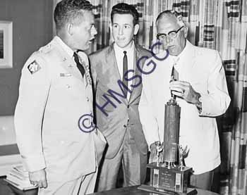Accession Number:2001-51.428 Accession Date: Condition:good Location:Ward, box 6, folder 98 Keywords:Ward, Chancellor, KTTS, television, radio, military, uniform, trophy, men Area of Origin:Springfield, MO Period:ca. 1965 Category:documentary artifact Object:print, photographic Maker:uk Description/History:A black and white photo of three men standing around a trophy. The man (left) wears a military uniform. News-Leader Photo Information: