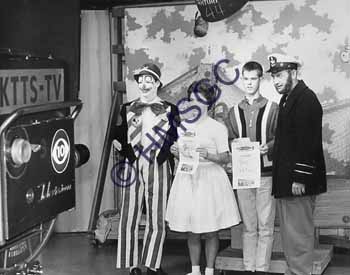 |  Accession Number:2001-51.445  Accession Date:  Condition:good  Location:Ward, box 7, folder 5  Keywords:Ward, Chancellor, KTTS, 1960, television, radio, Captain Briny, clown, children, prizes, camera  Area of Origin:Springfield, MO  Period:ca. 1965  Category:documentary artifact  Object:print, photographic  Maker:uk  Description/History:A black and white photo (L to R) of a clown, young girl and boy, and Captain Briny.  The two children hold 20, 000 Leagues Under the Sea posters.  News-Leader Photo Information: |