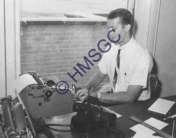 Accession Number:2001-51.465 Accession Date: Condition:good Location:Ward, box 7, folder 25 Keywords:Ward, Chancellor, KTTS, television, radio, men, typewriter Area of Origin:Springfield, MO Period:ca. 1965 Category:documentary artifact Object:print, photographic Maker:uk Description/History:A black and white photo of a man typing. News-Leader Photo Information: