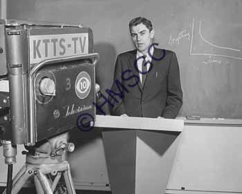 Accession Number:2001-51.470 Accession Date: Condition:good Location:Ward, box 7, folder 30 Keywords:Ward, Chancellor, KTTS, television, radio, men, camera, Mignard Area of Origin:Springfield, MO Period:ca. 1965 Category:documentary artifact Object:print, photographic Maker:uk Description/History:A black and white photo of a man standing at a podium with a chalkboard in the background and a camera filming him. News-Leader Photo Information:
