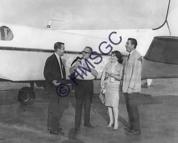 Accession Number:2001-51.472 Accession Date: Condition:good Location:Ward, box 7, folder 32 Keywords:Ward, Chancellor, KTTS, television, radio, people, airplane Area of Origin:Springfield, MO Period:ca. 1965 Category:documentary artifact Object:print, photographic Maker:uk Description/History:A black and white photo of four people standing in front of an airplane. News-Leader Photo Information:
