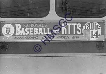 Accession Number:2001-51.529 Accession Date: Condition:good Location:Ward, box 7, folder 89 Keywords:Ward, Chancellor, 1960, television, radio, KTTS, ad, advertisment, baseball, K.C. Royals, sports Area of Origin:Springfield, MO Period:ca. 1965 Category:documentary artifact Object:print, photographic Maker:uk Description/History:A black and white photo of an ad on the back of a bus promoting the K.C. Royals on KTTS radio. News-Leader Photo Information: