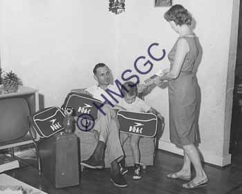 |  Accession Number:2001-51.536  Accession Date:  Condition:good  Location:Ward, box 7, folder 96  Keywords:Ward, Chancellor, 1960, KTTS, television, radio, family, travel, trip, suitcases, tickets  Area of Origin:Springfield, MO  Period:ca. 1965  Category:documentary artifact  Object:print, photographic  Maker:uk  Description/History:A black and white photo of a young boy and his family waiting to catch a flight.  The wife hands her husband their plane tickets.  The little boy won this trip in Yogi Bear's Jellybean Sweepstakes.  News-Leader Photo Information: |