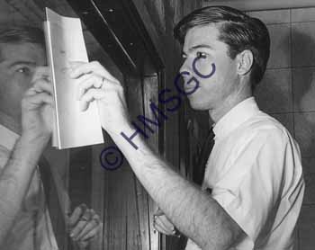 Accession Number:2001-51.559 Accession Date: Condition:good Location:Ward, box 8, folder 9 Keywords:Ward, Chancellor, KTTS, television, radio, men Area of Origin:Springfield, MO Period:ca. 1965 Category:documentary artifact Object:print, photographic Maker:uk Description/History:A black and white photo of a young man looking into glass. News-Leader Photo Information: