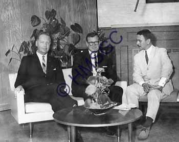 Accession Number:2001-51.564 Accession Date: Condition:good Location:Ward, box 8, folder 14 Keywords:Ward, Chancellor, KTTS, television, radio, men Area of Origin:Springfield, MO Period:ca. 1965 Category:documentary artifact Object:print, photographic Maker:uk Description/History:A black and white photo of three men sitting around a coffee table and floral arrangement. News-Leader Photo Information: