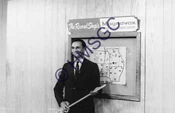 | Accession Number:2001-51.572 Accession Date: Condition:good Location:Ward, box 8, folder 22 Keywords:Ward, Chancellor, KTTS, television, radio, men, Magnavox, records, sword Area of Origin:Springfield, MO Period:ca. 1965 Category:documentary artifact Object:print, photographic Maker:uk Description/History:A black and white photo of a man standing in front of a regional map labled: The Record Shop's Magnavox Home Entertainment Center. He holds a sword in his hands. News-Leader Photo Information: |
