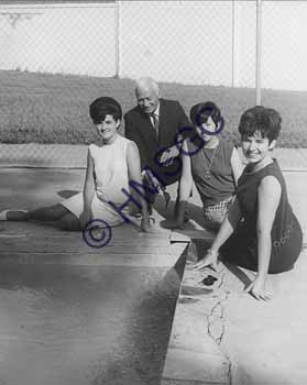 Accession Number:2001-51.583 Accession Date: Condition:fair Location:Ward, box 8, folder 33 Keywords:Ward, Chancellor, KTTS, television, radio, women Area of Origin:Springfield, MO Period:ca. 1965 Category:documentary artifact Object:print, photographic Maker:uk Description/History:A black and white photo of three young women and an older man seated by a swimming pool. News-Leader Photo Information: