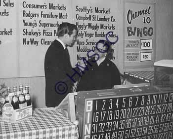 Accession Number:2001-51.586 Accession Date: Condition:good Location:Ward, box 8, folder 36 Keywords:Ward, Chancellor, KTTS, television, radio, bingo, CH 10, gameshow Area of Origin:Springfield, MO Period:ca. 1965 Category:documentary artifact Object:print, photographic Maker:uk Description/History:A black and white photo of a man interviewing a woman at a bingo contest on CH 10. News-Leader Photo Information: