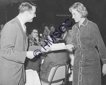 Accession Number:2001-51.597 Accession Date: Condition:good Location:Ward, box 8, folder 47 Keywords:Ward, Chancellor, KTTS, television, radio, check, people, Alpha Iota Area of Origin:Springfield, MO Period:ca. 1965 Category:documentary artifact Object:print, photographic Maker:uk Description/History:A black and white photo of a woman receiving a check from a man. The back reads: "Alpha Iota." News-Leader Photo Information: