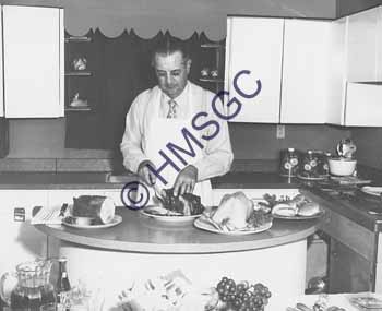 | Accession Number:2001-51.606 Accession Date: Condition:good Location:Ward, box 8, folder 56 Keywords:Ward, Chancellor, KTTS, television, radio, 1960, men, cooking, food, meat, turkey, chef, kitchen Area of Origin:Springfield, MO Period:ca. 1965 Category:documentary artifact Object:print, photographic Maker:uk Description/History:A black and white photo of a man with glasses and apron cutting into a roast and preparing several platters. He stands in a kitchen setting behind a counter. News-Leader Photo Information: |