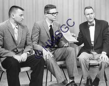 Accession Number:2001-51.608 Accession Date: Condition:good Location:Ward, box 8, folder 58 Keywords:Ward, Chancellor, KTTS, television, radio, 1960, men, glasses, suits, crew cut, Anderson Area of Origin:Springfield, MO Period:ca. 1960 Category:documentary artifact Object:print, photographic Maker:Ray Anderson of KTTS Description/History:A black and white photo of three men sitting in suits and wearing crew cuts. News-Leader Photo Information: