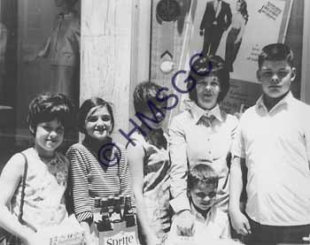Accession Number:2001-51.619 Accession Date: Condition:good Location:Ward, box 8, folder 69 Keywords:Ward, Chancellor, KTTS, television, radio, 1960, children, family, shopping Area of Origin:Springfield, MO Period:ca. 1965 Category:documentary artifact Object:print, photographic Maker:uk Description/History:A black and white photo of a family of six standing outside of a store front. Some of the children holding groceries. News-Leader Photo Information: