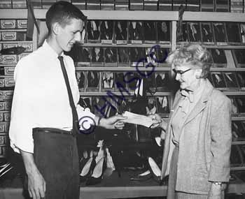 Accession Number:2001-51.620 Accession Date: Condition:good Location:Ward, box 8, folder 70 Keywords:Ward, Chancellor, KTTS, television, radio, 1960, store, shoe, check Area of Origin:Springfield, MO Period:ca. 1965 Category:documentary artifact Object:print, photographic Maker:uk Description/History:A black and white photo of a young boy exchanging a check with an elderly woman in a shoe store. News-Leader Photo Information: