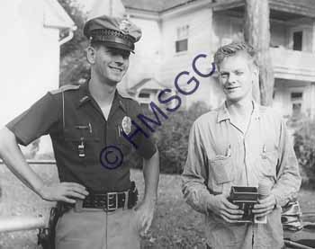 Accession Number:2001-51.623 Accession Date: Condition:good Location:Ward, box 8, folder 73 Keywords:Ward, Chancellor, KTTS, television, radio, 1960, police, officers, men Area of Origin:Springfield, MO Period:ca. 1965 Category:documentary artifact Object:print, photographic Maker:uk Description/History:A black and white photo of a police officer and another man standing next to eachother outside in a residential area. News-Leader Photo Information:
