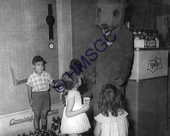 Accession Number:2001-51.625 Accession Date: Condition:good Location:Ward, box 8, folder 75 Keywords:Ward, Chancellor, KTTS, television, radio, 1960, panther, Sprite, children Area of Origin:Springfield, MO Period:1967 Category:documentary artifact Object:print, photographic Maker:uk Description/History:A black and white photo of 1967 promo of green panther promo for Sprite. News-Leader Photo Information: