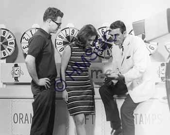 Accession Number:2001-51.631 Accession Date: Condition:good Location:Ward, box 8, folder 81 Keywords:Ward, Chancellor, KTTS, television, radio, 1960 Area of Origin:Springfield, MO Period:ca. 1965 Category:documentary artifact Object:print, photographic Maker:uk Description/History:A black and white photo of two people looking down at what the third man (left is holding. News-Leader Photo Information: