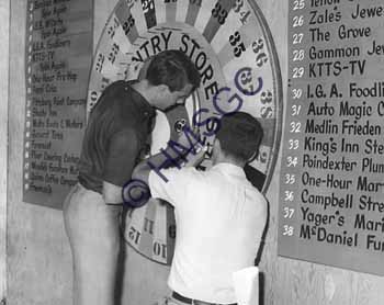 Accession Number:2001-51.633 Accession Date: Condition:good Location:Ward, box 8, folder 83 Keywords:Ward, Chancellor, KTTS, television, radio, 1960, men, Country Store Sweepstakes, prizes Area of Origin:Springfield, MO Period:ca. 1965 Category:documentary artifact Object:print, photographic Maker:uk Description/History:A black and white photo of two men working on the Country Store Sweepstakes wheel. News-Leader Photo Information: