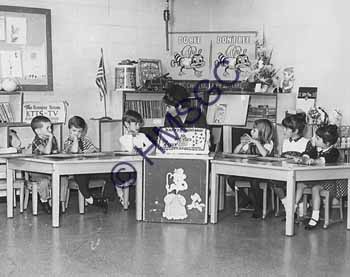|  Accession Number:2001-51.639  Accession Date:  Condition:good  Location:Ward, box 8, folder 89  Keywords:Ward, Chancellor, KTTS, television, radio, 1960, education, birthday, cake, teacher, Romper Room, children  Area of Origin:Springfield, MO  Period:ca. 1965  Category:documentary artifact  Object:print, photographic  Maker:uk  Description/History:A black and white photo of six children sitting at a birthday party with Miss Jo of Romper Room.  News-Leader Photo Information: |