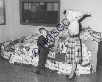 Accession Number:2001-51.649 Accession Date: Condition:good Location:Ward, box 8, folder 99 Keywords:Ward, Chancellor, KTTS, television, radio, 1960, Gold Bond, boy, boxes Area of Origin:Springfield, MO Period:ca. 1965 Category:documentary artifact Object:print, photographic Maker:uk Description/History:A black and white photo of a young boy holding a Gold Bond box and a woman standing with her hair wrapped in paper. News-Leader Photo Information: