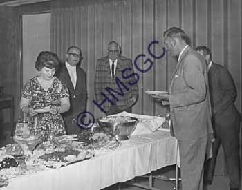 Accession Number:2001-51.655 Accession Date: Condition:good Location:Ward, box 8, folder 105 Keywords:Ward, Chancellor, KTTS, television, radio, 1960, buffet, people, food Area of Origin:Springfield, MO Period:ca. 1965 Category:documentary artifact Object:print, photographic Maker:uk Description/History:A black and white photo of people taking food from a buffet table. News-Leader Photo Information: