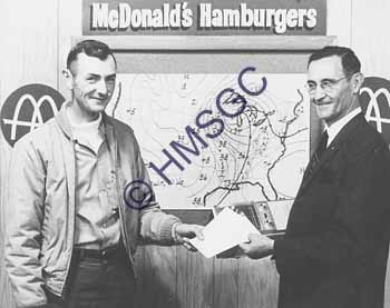Accession Number:2001-51.666 Accession Date: Condition:good Location:Ward, box 8, folder 116 Keywords:Ward, Chancellor, KTTS, television, radio, 1960, McDonald's, hamburgers, fast, food, preservation Area of Origin:Springfield, MO Period:ca. 1965 Category:documentary artifact Object:print, photographic Maker:uk Description/History:A black and white photo of two men exchanging a prize sponsored by McDonald's fast food chain. News-Leader Photo Information: