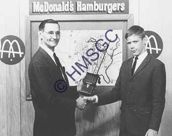 |  Accession Number:2001-51.667  Accession Date:  Condition:good  Location:Ward, box 8, folder 117  Keywords:Ward, Chancellor, 1960, KTTS, television, radio, McDonald's, weather, prediction, sponsor, winner, prize  Area of Origin:Springfield, MO  Period:ca.1965  Category:documentary artifact  Object:print, photographic  Maker:uk  Description/History:A black and white photo of a boy shaking hands with a man in front of a weather map sponsored by McDonald's hamburgers.  The boy won a prize for accurately predicting the weather for the first day of spring.  News-Leader Photo Information: |