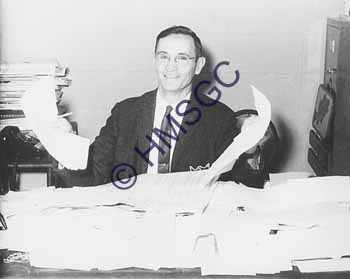Accession Number:2001-51.669 Accession Date: Condition:good Location:Ward, box 8, folder 119 Keywords:Ward, Chancellor, 1960, KTTS, television, radio, men, work Area of Origin:Springfield, MO Period:ca. 1965 Category:documentary artifact Object:print, photographic Maker:uk Description/History:A black and white photo of a man behind a desk piled high with papers. News-Leader Photo Information: