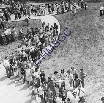 Accession Number:2001-51.670 Accession Date: Condition:good Location:Ward, box 8, folder 120 Keywords:Ward, Chancellor, 1960, KTTS, television, radio, crowd Area of Origin:Springfield, MO Period:ca. 1965 Category:documentary artifact Object:print, photographic Maker:uk Description/History:A black and white photo of a crowd of people along a sidewalk. News-Leader Photo Information: