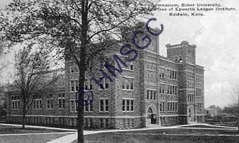 Accession Number:2002-335 Accession Date: Condition:fair Location:postcard, box 1, folder 136 Keywords:postcard, university, Baker, Baldwin, gym Area of Origin:uk Period:9/15/1940 Category:documentary artifact Object:postcard Maker:Morgan Book Co., Baldwin, KS Description/History:A postcard of gym, Baker University, meeting place of Epworth League Institute, Baldwin, KA. News-Leader Photo Information: