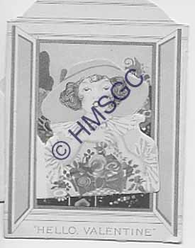 | Accession Number:2002-885.29 Accession Date: Condition:good Location:Photographic Archives Keywords:Greeting card, valentine , ca 1918 Area of Origin:Mt. Vernon Period:ca 1918 Category:Documentary Artifact Object:Greeting Card Maker:UK Description/History:It is a square card with an illustration of a girl with roses looking out of a window. It is a 3 -dimensional card. The girl is on a separate fold than the window with the illustration of a garden. The text reads "Hello Valentine" on the bottom. It is a valentine given to Mary Ruth Johnson McShane of Mt. Vernon during her school years. News-Leader Photo Information: |
