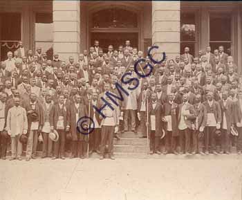 | Accession Number:2005-18 Accession Date: Condition:good Location:Archives, Photo Coll. Black History Coll. B 4 F38 Keywords:African American, A S Jones, A M Smith, Fraternal orders, men, Masonic, Looney home Area of Origin:UK Period:1880s? Category:Documentary Artifact Object:Print Maker:UK Description/History:Sepia tone photo on board of a group of African American men standing before a building. A Masonic group, (Prince Hall, or Eureka or Truth Lodge) possibly at a state or national convention, maybe in St. Louis or Kansas City. The back of the photo reads: "A M Smith, A S Jones, Independence, Box----." Photo found by donor in the Looney home at 1509 N Sherman. News-Leader Photo Information: |
