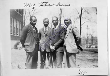 | Accession Number:2006-137-223 Accession Date: Condition:fair Location:Black History, B10, F104 Keywords:Teachers, School, Student, Fred Verrege, Stella Anderson, Black History, African American, Men Area of Origin:uk Period:1934 Category:Documentary Artifact, Photograph Object:Photograph Maker:The Duncan Studio Description/History:A photograph of four male teachers all wearing suits. The photograph reads "My teachers" and "1934." The picture was taken by the Duncan Studio and has a #12 stamped on the back side. News-Leader Photo Information: |