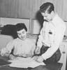 | 1992-232.1954 | | A black and white photo of two Central High School students sharing their work. The female student is seated while the male student is standing to her left. |
